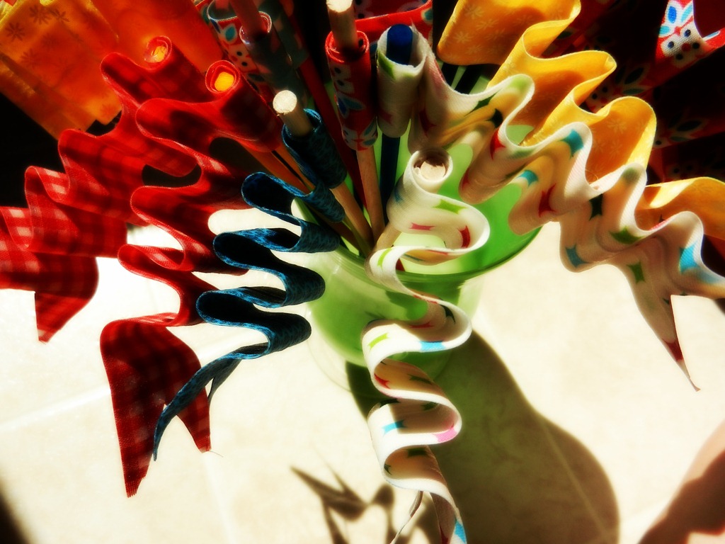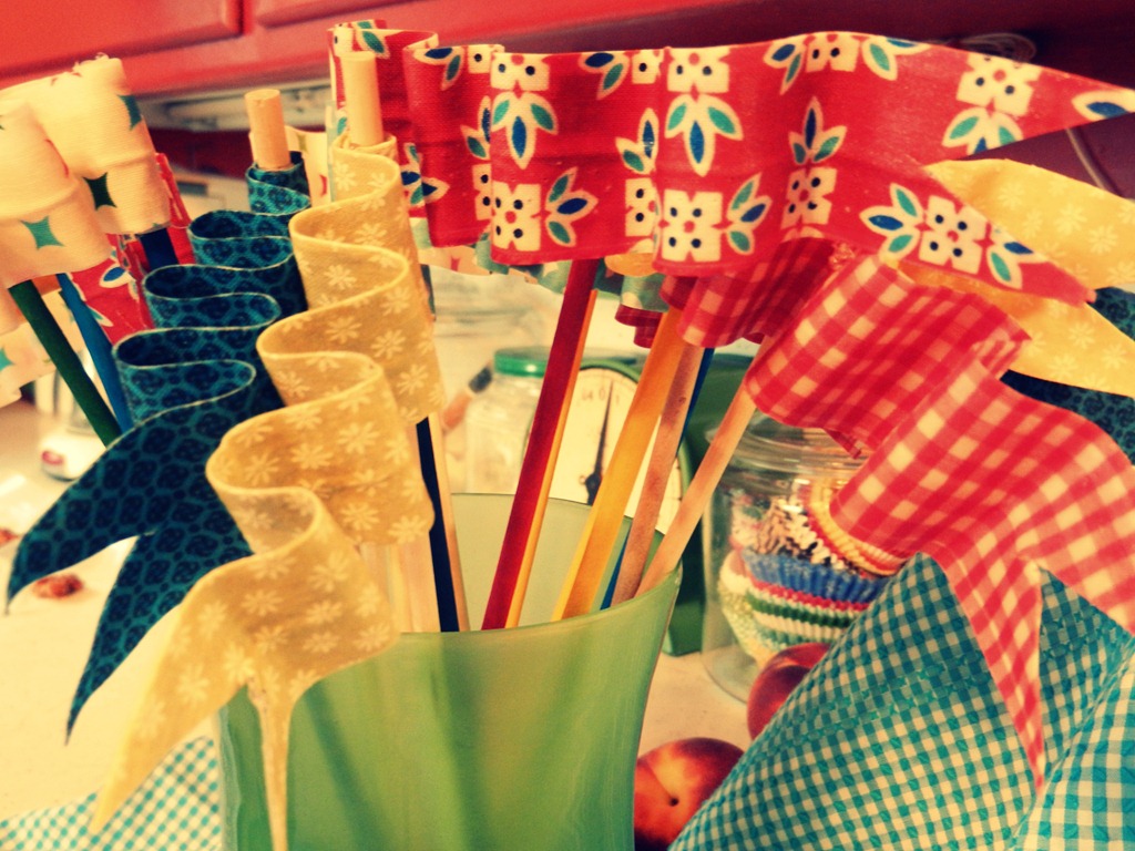 Wrap one of your fabric strips tightly around a bamboo skewer. It will be stiff and you may need to work it a bit to bend it around the skewer. If it won’t stay, use some hot glue to make sure it doesn’t detach from the skewer. Snip the ends on an angle to create a notched effect.