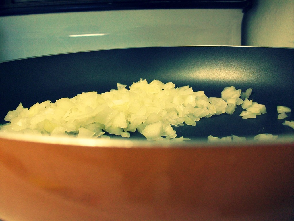 Mince a medium onion. Add 1 1/2 lbs. of hamburger. It also helps if you have an awesome sister named Kellee who buys you fantastic Pampered Chef utensils like the mix-masher-tool-of-fabulousity.